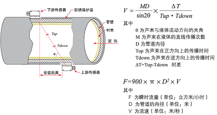 當(dāng)超聲波束在液體中傳播時(shí),液體的流動(dòng)將使傳播時(shí)間產(chǎn)生微小變化,其傳播時(shí)間的變化正比于液體的流速,零流量時(shí),兩個(gè)傳感器發(fā)射和接收聲波所需的時(shí)間完全相同(唯一可實(shí)際測(cè)量零流量的技術(shù)),液體流動(dòng)時(shí),逆流方向的聲波傳輸時(shí)間大于順流方向的聲波傳輸時(shí)間。其關(guān)系符合下面表達(dá)式: