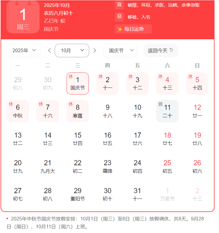 3、法定假日:10月1日至3日為法定假日。